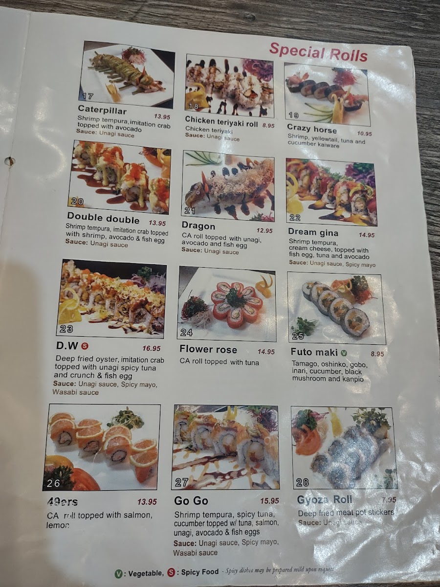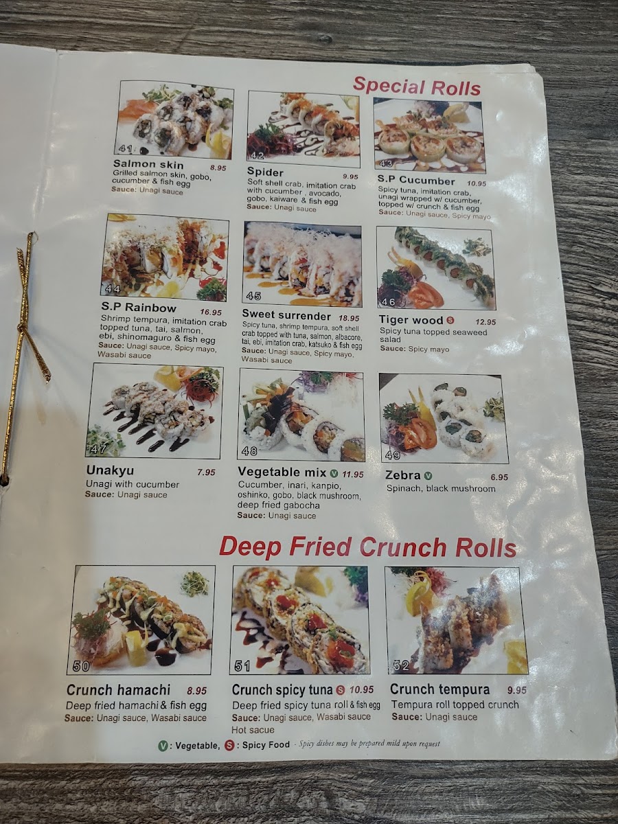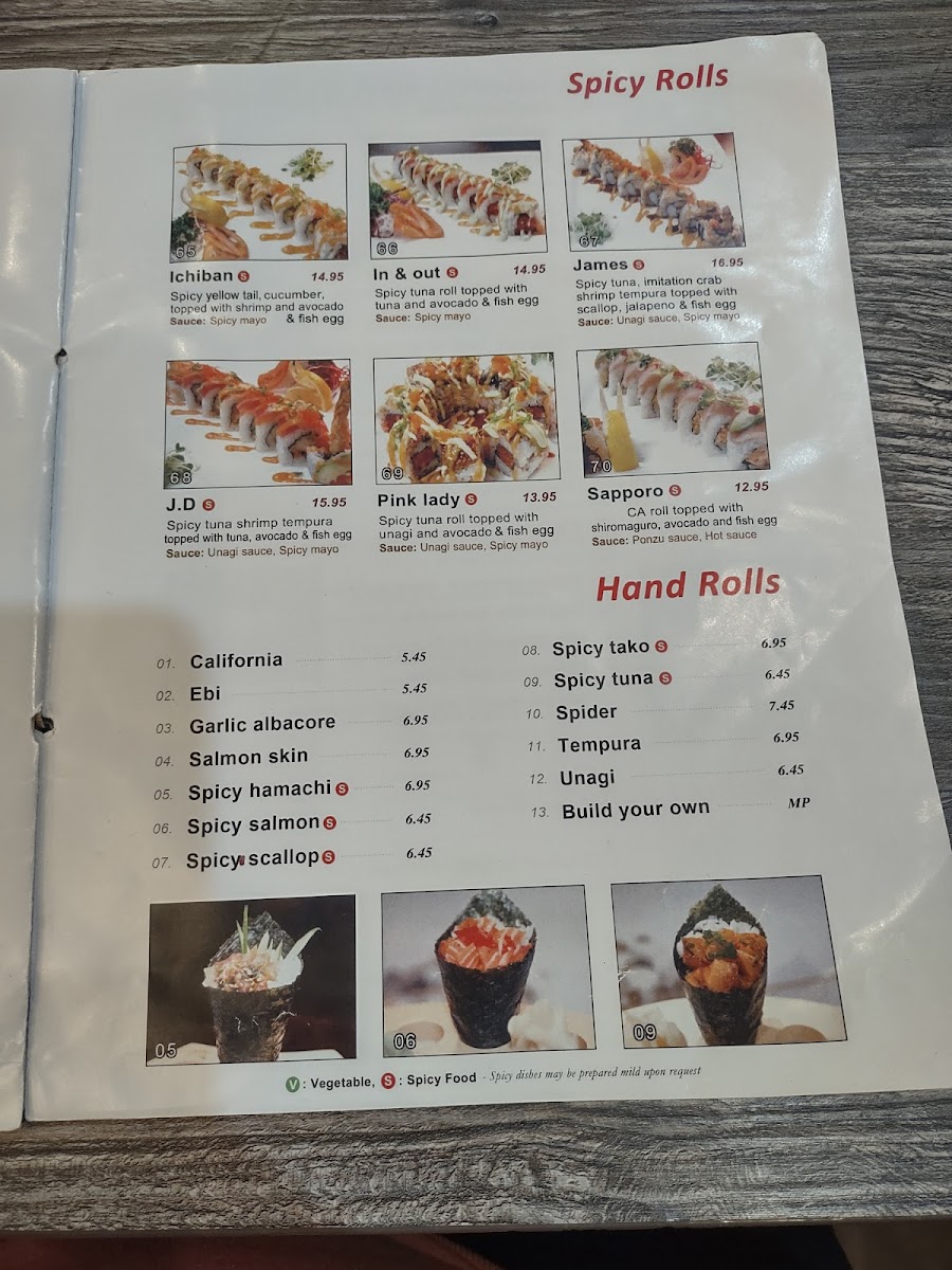 The lunch menu highlights a range of special and spicy sushi rolls such as the Tiger Wood, Ryan, J.D, Pink Lady, and Sapporo rolls. These items offer a selection of flavors suitable for quick lunch orders or casual meals.