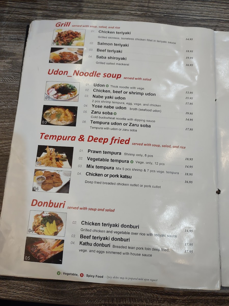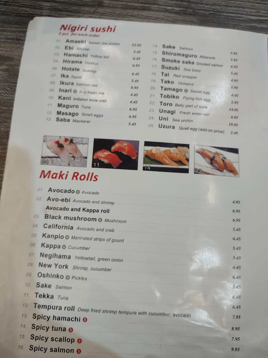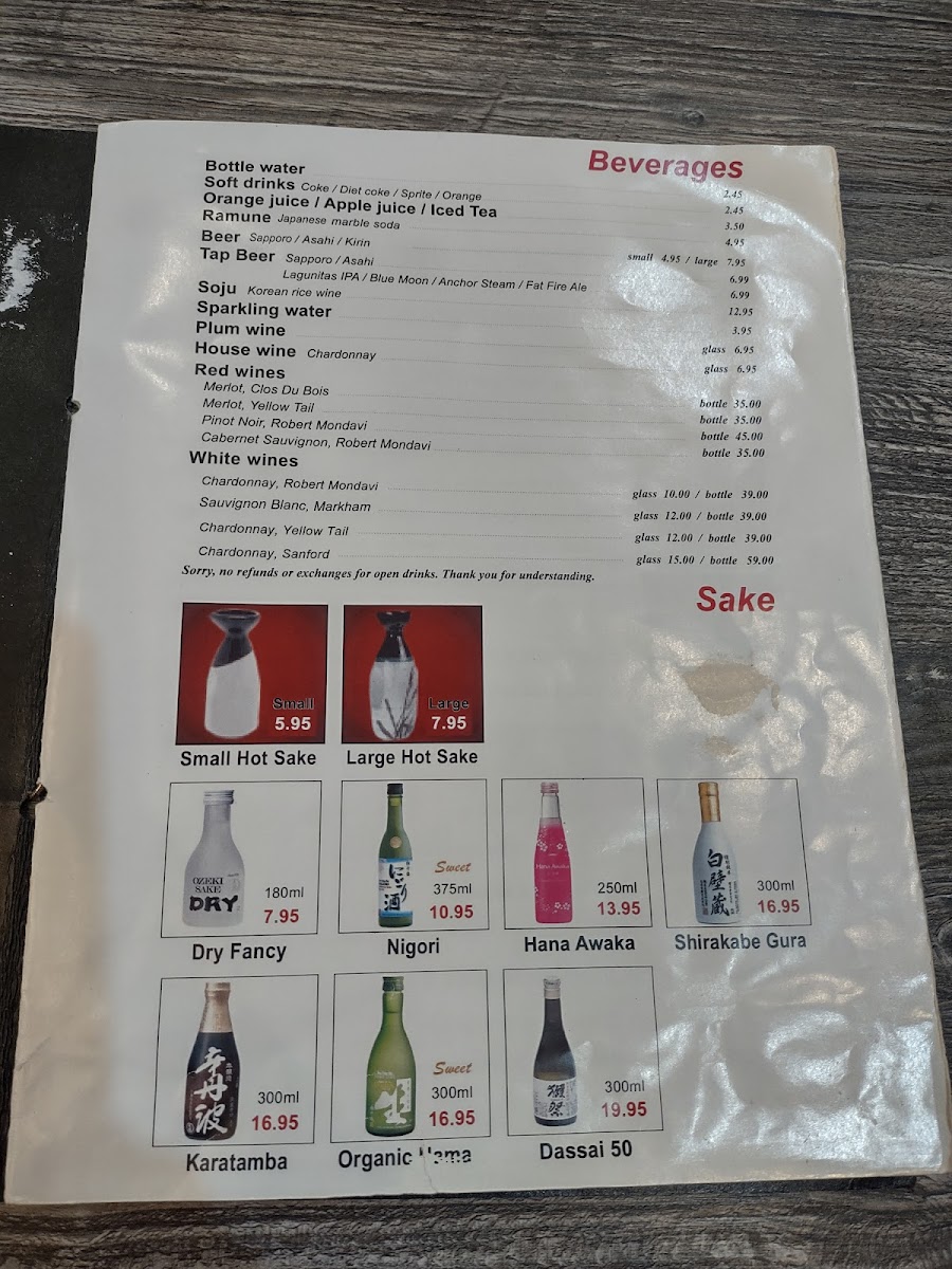 Beverage options include items such as Nigori sake, complementing the meal selections. The menu is designed to accommodate a variety of dining preferences, from light bites and sushi rolls to more substantial entrees, suitable for casual dining occasions and catering needs.