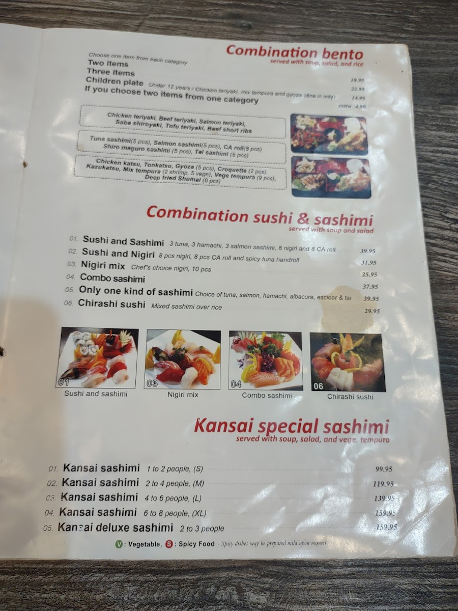 Additional menu categories include teriyaki entrees with chicken, beef, and salmon, plus traditional Japanese appetizers like miso soup, edamame, and seaweed salad. Seafood combinations such as sashimi deluxe, chirashi don, and sashimi combos provide more comprehensive meal options.